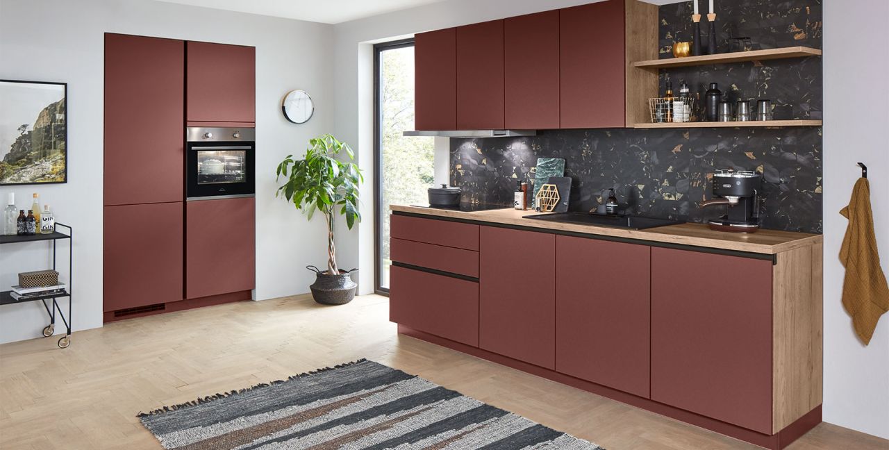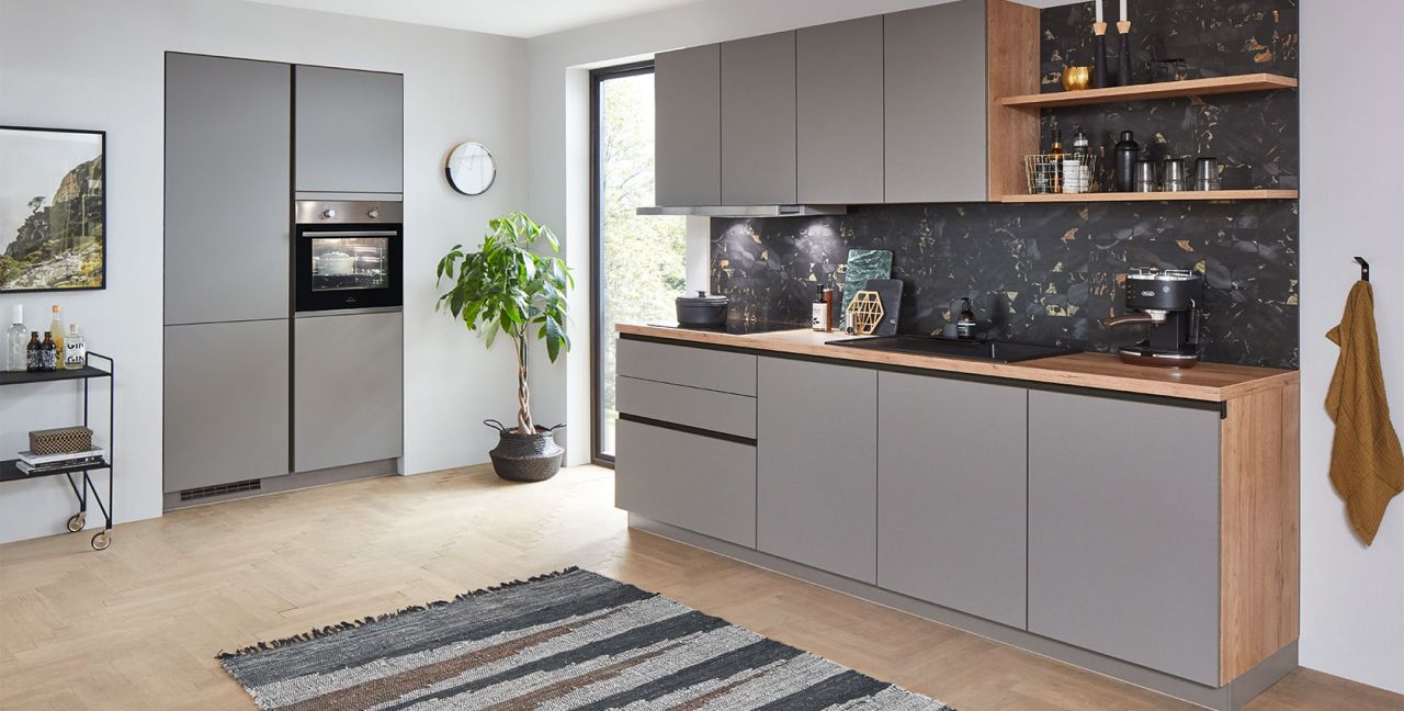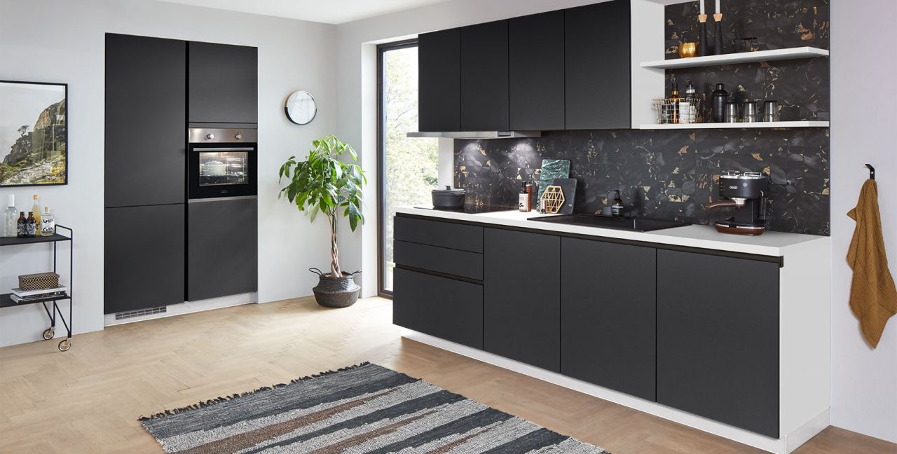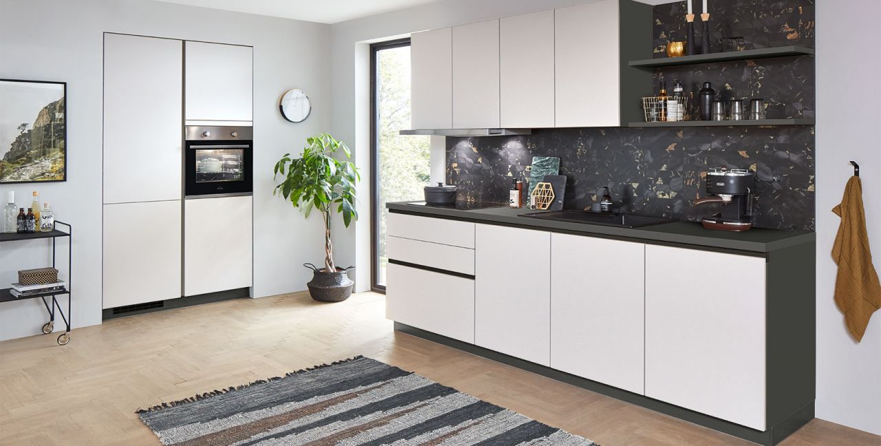 Inklusive Einbaubackofen Edelstahl Progress PBN13002X Energieeffizienzklasse A, Glaskeramik Kochfeld Progress PAS6001E, Flachschirmhaube Progress PDP9040E Energieeffizienzklasse A, Kühlschrank Progress PK1215 Energieeffizienzklasse E, Einbau-Designspüle Elleci Logik 300, XL-Schränken, Unterschrank mit Großraumauszügen, Wandborden.